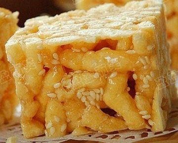 2、取一容器,底部刷一层油,均匀的撒上黑、白芝麻和松仁,坐锅点火加少许水,放入白糖炒化,倒适量蜂蜜,放入炸好的面条,翻炒使其均匀沾上糖,取出放进装有芝麻和松仁的容器中,压紧定型后倒出即可。