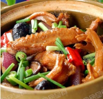 鸭翅,鸭掌,干香菇,洋葱,红椒,生姜,杭椒,九层塔,客家老黄酒,芝麻油,酱油,葱