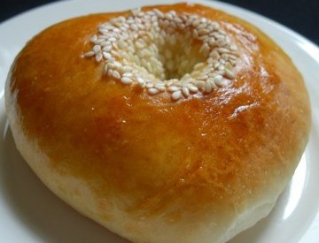 1.将面团分割成80克左右重的面团,滚圆后松弛15分钟。将面团用擀面杖擀薄些,中间放上25克左右的豆沙馅;