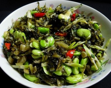 2、下雪菜、笋、蚕豆米,大火煸炒,略放点糖。至于盐,要看雪菜的咸度来酌情来放,炒至蚕豆米酥了即可。
