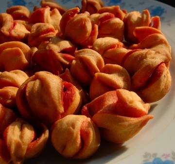 2、油水面,又加了糖,揉起来相当地费劲。揉光面团,擀平,折叠,切成小方块。为了颜色好看点,一部分我还加点红曲粉进去捏,这种炸出来象小灯笼。