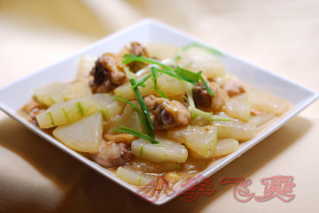 4.先将冬瓜煮熟后盛起,然后再将鸡炆熟后将煮熟的冬瓜倒入拌匀调味勾芡便可。