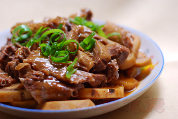 3、另起镬放油将切好的葛略炒后加入清水,再放入煎过的鹅,加生抽、老抽和白糖,加盖炆至谂后放盐调味。