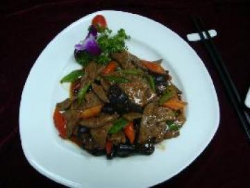 3、另起锅加油爆香葱姜蒜,炒香青红椒,加适量汤水,调好味加入滑熟的肝片、木耳炒匀,勾芡淋香油即可。
