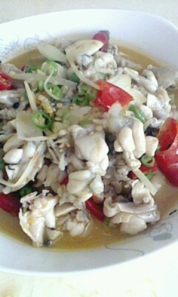 5、炒锅内下少许油烧热,下泡姜米、泡椒节炒出香味,下牛蛙,烹入料酒,放味精、大葱节簸转起锅装盘即可。