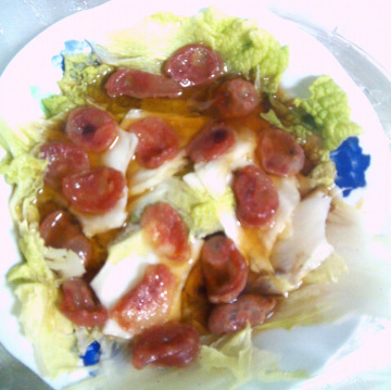 1、白菜洗净撕碎铺在盘底,香肠切片均匀铺在盘子上层