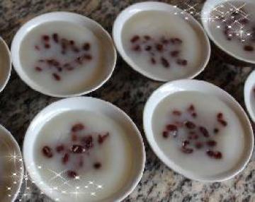 3、把小碗涂油后蒸热,每只碗放适量红豆,倒入粉浆至七分满,排列于蒸茏内,用猛火蒸约20分钟,可用竹签挑出食用。