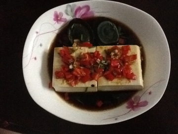 嫩豆腐2块,甜红椒半个(切成小块),皮蛋1个,葱花,盐,酱油(或生抽)