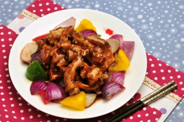 5、伴碟青紅黃椒蔥爆略炒上碟,跟著擺放豬腩骨。再將部分鍋內湯汁勾芡淋在豬腩骨上。