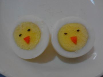 2、红萝卜切小三角型粘在蛋黄上做嘴巴;