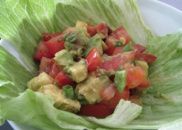 1、番茄切块状,牛油果切粒(约3x3厘米左右),葱、洋葱切碎,和调味品一起拌好(不要搅拌太久,因为番茄容易出水)