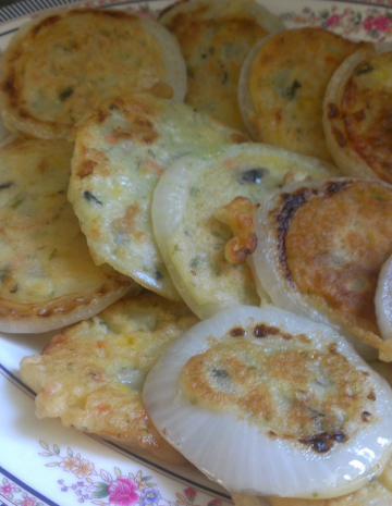 5、用不粘鍋加熱,放入少許油。開中小火,放入洋蔥圈先,然後在圈內倒入麵糊。