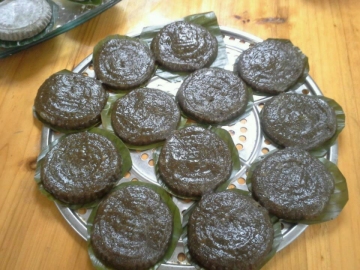 4、将做好的糍耙底部垫上香蕉叶后,上蒸笼大火蒸15分钟。
