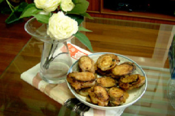(3)勺内放油,烧六七成热,把茄夹逐个下入勺内炸熟,呈金黄色时捞出沥油装盘,放椒盐即好。