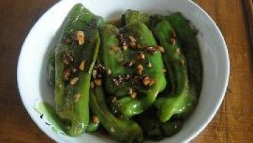 青椒适量.蒜1个.花椒8粒.生抽.糖.醋.鸡精.香油少许