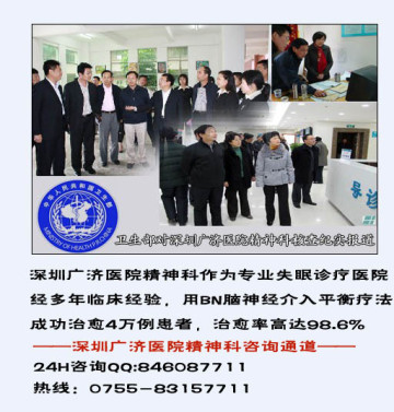 深圳广济医院精神科★专家在线qq:846087711,健康热线tel:0755-83157711★专业治疗:失眠症、抑郁症、焦虑症、强迫症、精神障碍、躁狂症、恐惧症、头痛等精神疾病。如果您有什么疑问咨询在线专家,专家会为您做详细解答!国际认证“bn脑神经介入平衡疗法”对治疗精神疾病疗效显著,治愈率更是高达98.6%,3万康复患者共同见证。