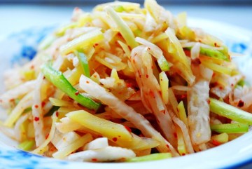 4、三样东东放一起,加点苹果醋、辣椒面、盐、糖,拌好即可。