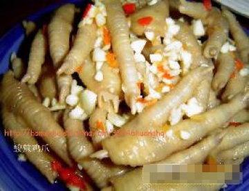 鸡脚1斤,蒜米2两,香油少许,白糖,米醋,酱油,辣椒酱,盐