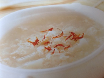 3、锅内倒入高汤、白芷煮熟,续加银耳、山药,煮约5分钟后加盐调味,再倒入淀粉1大匙勾芡,改小火,起锅前把鸡蓉慢慢加入搅匀后熄火,倒入深盘内,撒上藏红花即可。