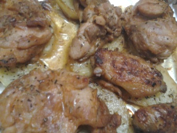4、然后将煎好的鸡扒放在焗盘的薯仔片上层,再撒少许椒盐和香草,放入焗爐200度,上下热焗25分钟!搞定!