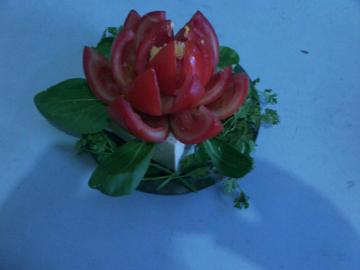 主料:3个西红柿,一块豆腐,铺料:一个鸡蛋黄,荷叶用青菜叶代替,盐1克,白糖3克,味精1克,香菜四颗,适量放点料酒