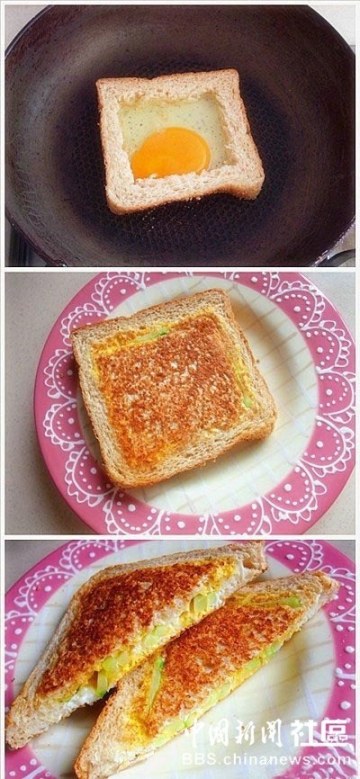 1、把面包中间切掉,放入锅中,再往面包中间打入一个鸡蛋。