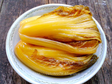 4)然后用重物压着,上盖,放置阴凉处,静置约10 - 14 天至芥菜变酸变黄而且变得有些透明,即成