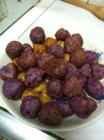 5、油充分预热,将紫薯泥团成圆形,小火炸熟即可。