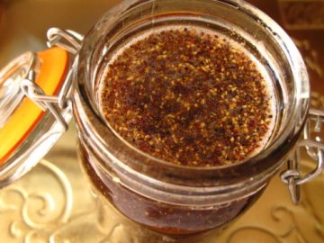 2)稍微凉后一勺一勺舀入花椒粉的瓶子里,用筷子从底部搅拌上来。
