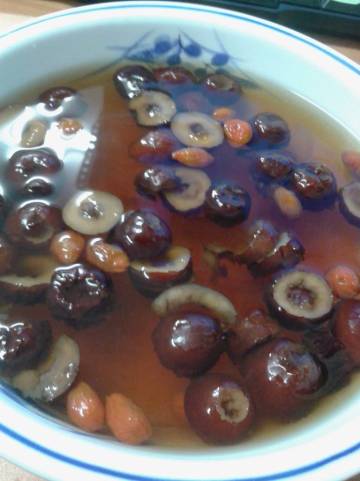 2、红枣泡水切片,枸杞泡水洗干净。