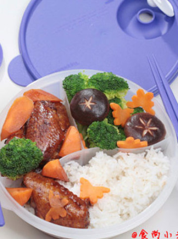 4.将炖好的鸡翅和时蔬晾凉,放入保鲜盒,保鲜盒的大格子里我盛的是米饭,肉菜分隔好,保证了饭菜不串味