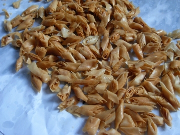 1、将春卷皮卷成蛋卷形状,并剪成一小块一小块。
