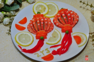 9、上下用胡萝卜片封口,摆上红椒丝、青豆、柠檬片即可。挤少许柠檬汁在虾上就能吃了~~~~~