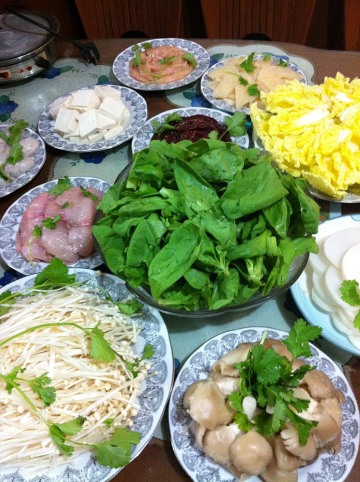 火锅料(可以适当加点海米、橄榄油之类)、水、蘸料或酱、各种“煮角”(蟹棒、鲜虾、鱿鱼圈、木耳、鸡肉肠、日本豆腐、土豆、生菜、胡萝卜、蘑菇。)
