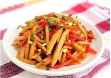 5.加和红椒丝炒至断生,再加盐调味,最后淋几滴香油即可