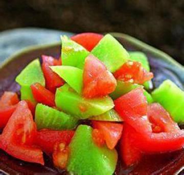 4、再放入莴笋丁、西红柿块、青蒜末拌匀即可,入冰箱贮存。