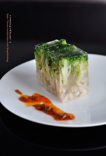 11、等猪皮汤稍微凝固成肉冻,把西兰花按入肉冻里。