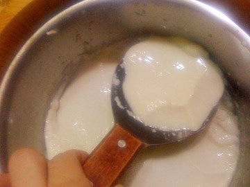 2、内酯加少许水调开,加入80度的豆浆中,轻轻搅拌几下后加盖静置约15分钟,即成豆腐花