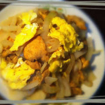 去骨鸡腿肉100公克,洋葱丝1/2颗,鸡蛋2颗,白饭适量,水100㏄,酱油30㏄,味醂25㏄,米酒15㏄