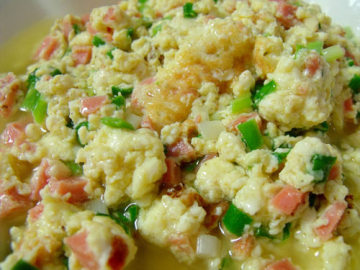 1.香葱多点好看也好吃。豆腐是类似豆腐脑的那种盒装嫩豆腐。 2. 豆腐打碎,和鸡蛋混合均匀,把切碎的火腿和香葱拌入充分搅拌,加入盐,胡椒粉。半汤匙食用油。 3. 锅上倒油,转一圈,试锅面沾一层油后,倒掉。烧七成热,倒入豆腐鸡蛋,不停的翻动,不要沾锅就好,等全部凝结,就好了。 4. 出锅放点味精提味,不喜欢的可以不放。 5. 豆腐会出水的,不要怕油少。