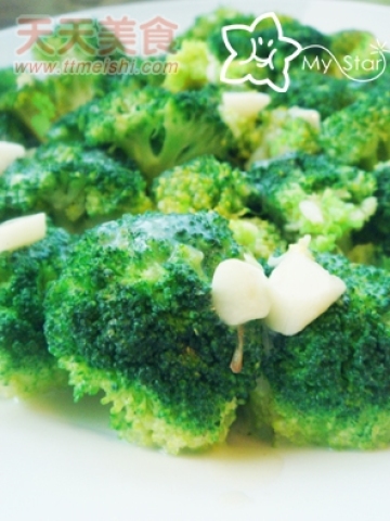 2.锅内加入植物油先下蒜蓉炒香,再放入西兰花加入盐,味精,鸡精翻炒,加入水淀粉勾芡淋香油装盘即可