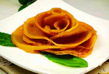 8.在萝卜卷中间切开,码放在盘中,整成花型即可