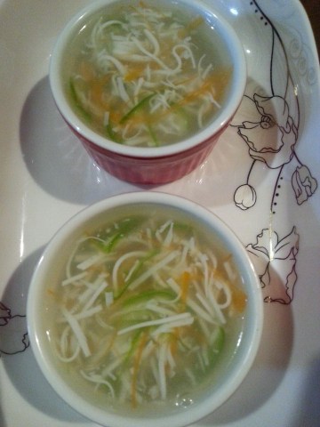 2、锅里放水、一点高汤,把三丝轻轻的倒入锅子,轻轻的用筷子拨弄一下。所有的动作都是要轻轻的哦!哈哈,也就是说轻功要相当的好。