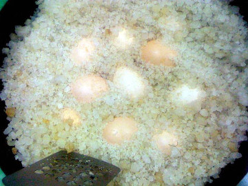 2、把鸡蛋放在盐上面,然后用大粒盐把鸡蛋全部封在盐下面。