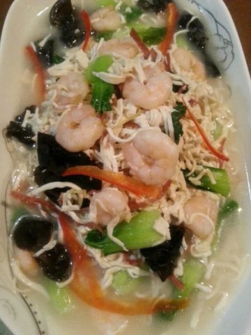 2、切好的丝用清水洗两遍,再用开水烫一下,沥干水分,配上火腿丝、木耳、虾仁(虾仁用胡椒粉、盐先腌制一下)、菜心。
