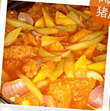 油炸猪皮,水晶凤梨1粒,蕃茄1粒,黄瓜1条,大葱1粒,蒜蓉1汤匙