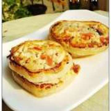 1. 准备豆腐、洋葱、香菇、火腿肠、葱。 2. 豆腐压碎成泥。 3. 香菇、火腿肠、葱切粒。 4. 洋葱切圈,用手分离,选取自已所用大小合适的。 5. 将豆腐泥与切好的香菇火腿葱末加盐、胡椒粉、鸡精、淀粉调成馅。 6. 锅中放少许油烧至微热,放入洋葱圈。 7. 锅中放少许油烧至微热,放入洋葱圈。 8. 将调好的馅料填满洋葱圈。 9. 煎好一面,翻面再煎。