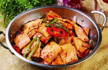 放入小方块豆腐边炒带煎至干褐色。