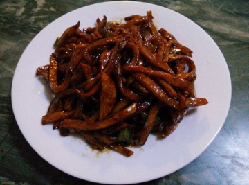 有点儿像鱼香口味的菜,只是没用郫县豆瓣,也就不能叫鱼香酱了。