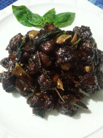 5、加糖收汁,再滴入几滴黑醋,放入紫苏快速翻炒。紫苏的香味带着黑醋特有的味道瞬间爆发,太神奇了。黑醋酱排完成,出锅装盘!